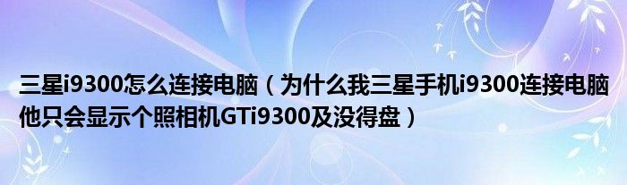 1,为什么我三星手机i9300连接电脑他只会显示个照相机GTi9300 没得盘:连接电脑以后,手机的下滑菜单栏会显示USB连接,点击那个,调成USB大容量存储,就可以了。