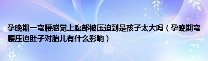 大家好,linda来为大家解答以上的问题。孕晚期一弯腰感觉上腹部被压迫到是孩子太大吗,孕晚期弯腰压迫肚子对胎儿有什么影响很多人还不知道,现在让我们一起来看看吧!